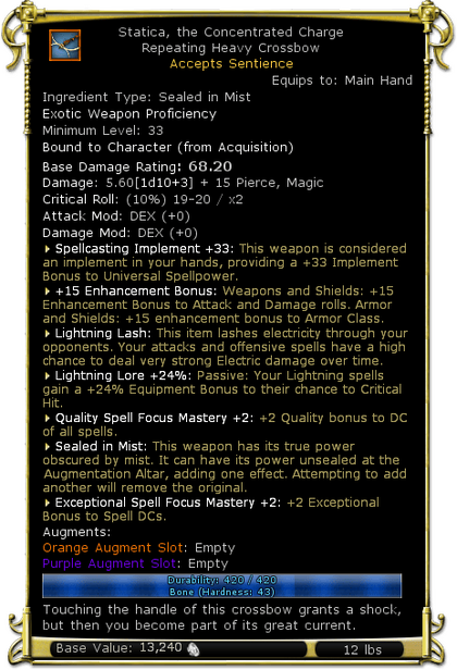 | Description | Touching the handle of this crossbow grants a shock, but then you become part of its great current. | |