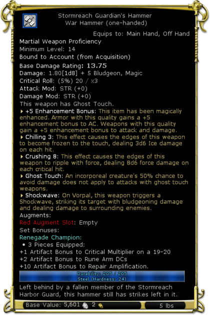 | Description | Left behind by a fallen member of the Stormreach Harbor Guard, this hammer still has strikes left in it. | |