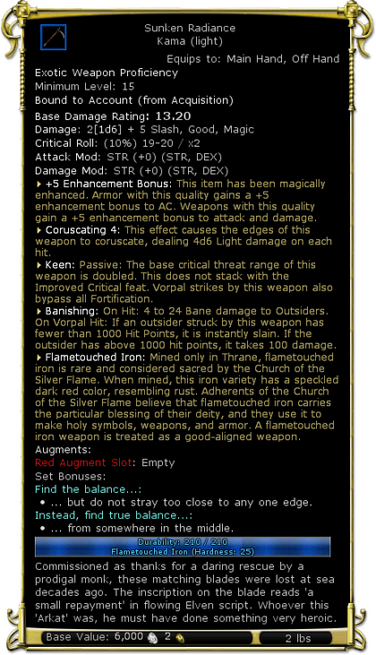 There are four "Sunken" kamas: Sunken Obscurity, Sunken Radiance, Sunken Virtue, and Sunken Blasphemy. A pair of these will grant Inevitable Balance - 5% Melee Power , 5% Doublestrike, and extra bane damage on sneak attack. So far observed that different variations will grant the same set bonus, although it was also observed that two of the same variations will also show an icon called "Too close to the edge" and gives the description "You are to close the edge of alignment, these weapons work best when they are different from one another." |