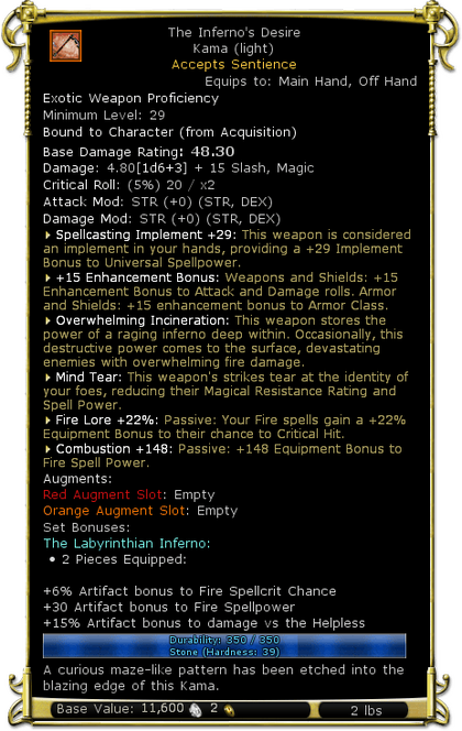 | Description | A curious maze-like pattern has been etched into the blazing edge of this Kama. | |