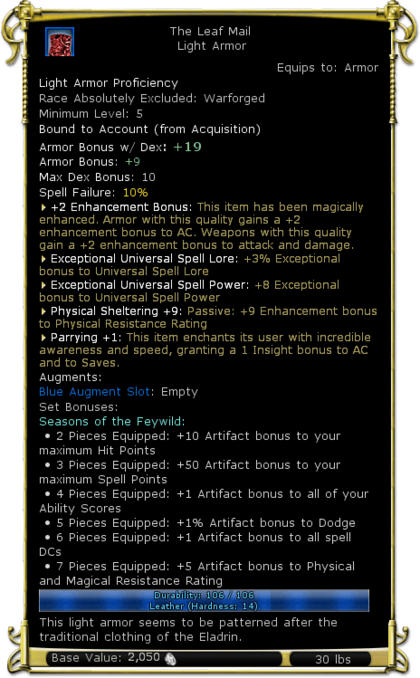 | Description | This light armor seems to be patterned after the traditional clothing of the Eladrin. | |