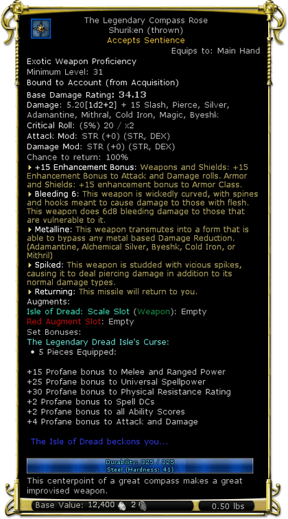 | Damage and Type | 5.20[1d2+2] + 15 Slash, Pierce, Silver, Adamantine, Mithral, Cold Iron, Magic, Byeshk | |