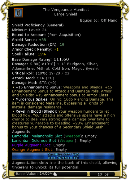 | Damage | 5.80[1d10+8] + 15 Bludgeon, Silver, Adamantine, Mithral, Cold Iron, Magic, Byeshk | |