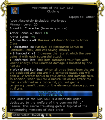 | Description | The Order of the Sun Soul is a monastic order dedicated to the welfare of the common fold of Faerun. This simple travelling garb is typical of the adventuring members of their order. | |