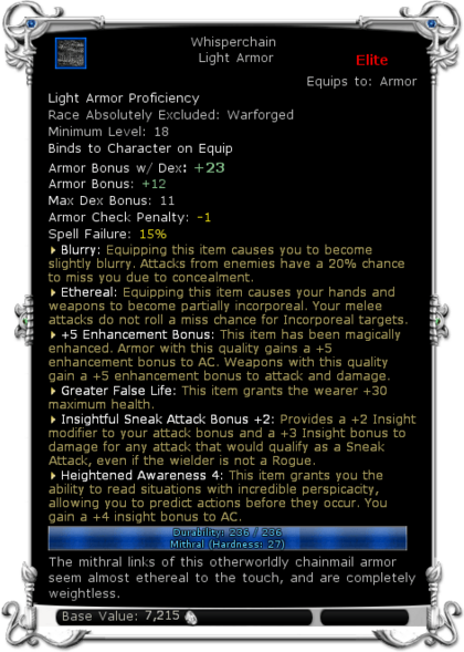 | Description | The mithral links of this otherworldly chainmail armor seem almost ethereal to the touch, and are completely weightless. | |