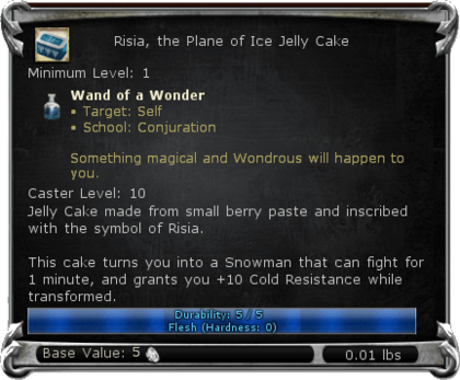 This cake turns you into a Snowman that can fight for 1 minute, and grants you +10 Cold Resistance while transformed