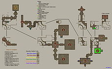 Move to the middle level on the south side of the South Pillar. Having someone with Evasion do this makes it a whole lot easier. Make sure they have lightning resist before they enter the room. Everyone else can wait outside and range kill any mobs that spawn in the room. Whoever is inside has to go and pull four random levers, just pull levers until the force field around the lever goes away. Pull the main lever at the back of the room. Have your cleric keep them healed as necessary. Bug: It is possible to walk around the right side of the room avoiding 2 lightning traps, jump onto the blue force field "protecting" the lever, flip the lever without flipping switches to deactivate lightning traps (Screenshot). There is a treasure chest to the east of this room, behind a Secret door with a very high Search DC:19 (Elite), with a randomly-appearing force trap triggered upon opening the chest. You can bypass the trap by moving to the side of the chest and edging forward until you can access the chest.